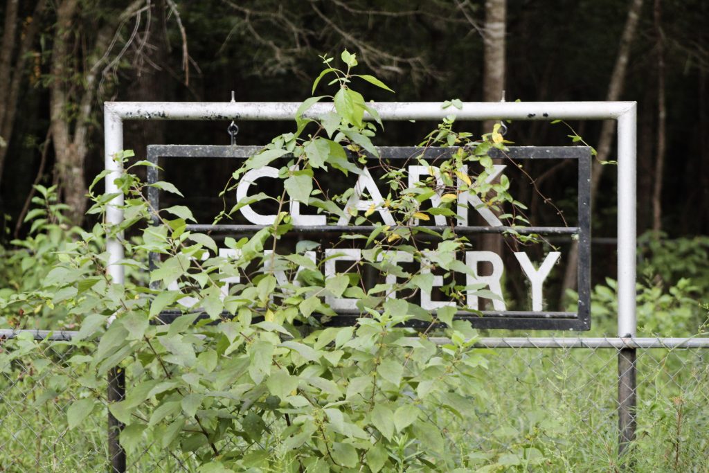 I know this is hard to read but it says: Clark Cemetery. This was tucked back into the woods again on a dirt county road. It looks like it has been forgotten and nature has started taking over again.